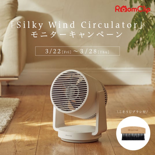 リズム株式会社(取締役社長 湯本武夫)は、住まいとインテリアの写真共有サービス「RoomClip(ルームクリップ)」を運営するルームクリップ株式会社(本社:東京都渋谷区、代表取締役社長:高重正彦)と、大風量2重反転ファンSilky Windシリーズの新商品、「こそうじ」しやすい2重反転ファンサーキュレーター「Silky Wind Circulator(シルキーウインドサーキュレーター)」モニターキャンペーンを、2024年3月22日(金)~ 3月28日(木)まで実施します。