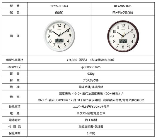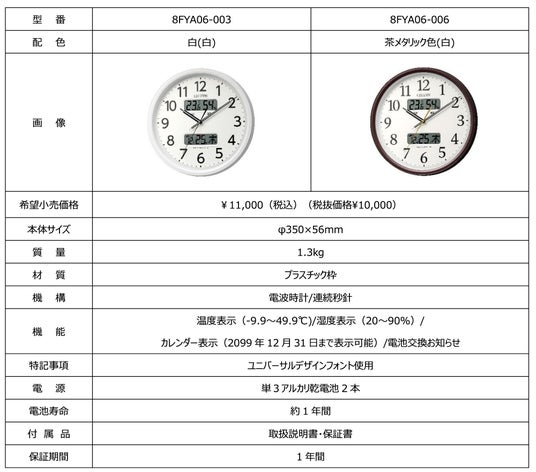 リズム株式会社(取締役社長 湯本武夫)は、時間が見やすく温度・湿度もわかる液晶付きの電波掛時計シリーズ「8FYA05-0」「8FYA06-0」を5月上旬より発売いたします。