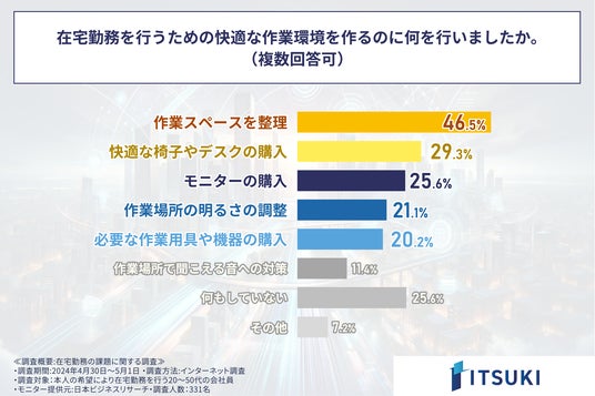 「在宅勤務を行うための快適な作業環境を作るのに何を行ったか」を問う次の設問への回答で最も多かったは、「作業スペースの整理」で46.5%となりました。2位は「快適な椅子やデスクの購入」で29.3%、3位は「モニターの購入」で25.6%と仕事環境を整えるガジェット類の購入にまつわる回答が続きましたが、意外であったのは同率3位が「何もしていない(25.6%)」となっており、在宅勤務における生産性を高める工夫を自分自身で行うことには少なからずハードルがあることもわかりました。