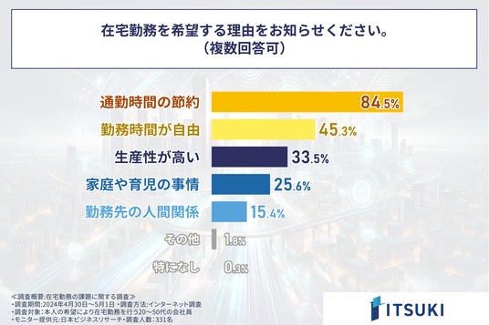 まず、「在宅勤務を希望する理由」を問う設問の回答では「通勤時間の節約」が圧倒的に多く84.5%で第1位、その次に「勤務時間が自由」が45.3%で2位に続き、在宅勤務は会社に出勤するよりも時間的自由度が高い点をメリットと感じていることがわかりました。