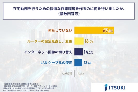 最後に、在宅勤務での仕事の生産性にもつながる「インターネット回線の速度」に関するもので「インターネット回線の速度改善に対して何か行ったか」を問う設問への回答は、1位「何もしていない」が圧倒的に多く67.0%。2位の「ルーターの設定見直し、変更(16.0%)」や3位「インターネット回線の切り替え(14.2%)」とかなり差があり、インターネット回線の速度は在宅勤務において、ビジネスパーソンからは盲点となっている現状が明らかになりました。