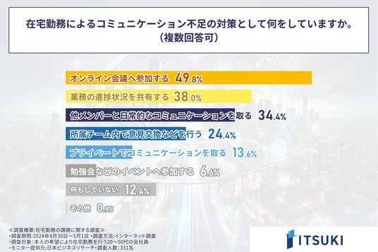 次に、在宅勤務によるコミュのケーション不足の対策として何をしているかを問う設問の回答は、1位「オンライン会議に参加する(49.8%)」、2位「業務の進捗状況を共有する(38.0%)」、3位「他メンバーと日常的なコミュニケーションを取る(34.4%)」となりました。この結果から、在宅勤務は仕事仲間と同じ空間を共にしない環境であるがゆえに、オンラインツールなどを使いながら、自ら積極的に仕事仲間とコミュニケーションを取っていく必要があるとわかりました。