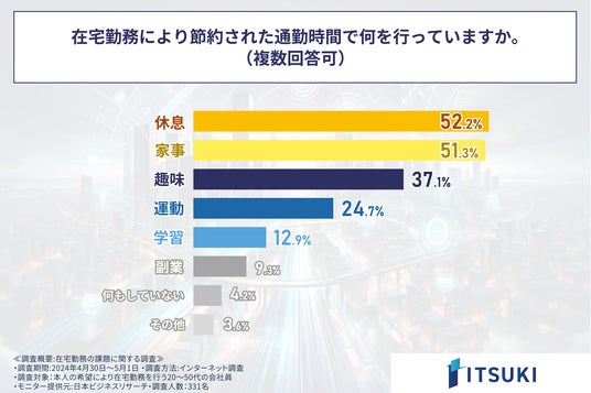 「在宅勤務により節約された通勤時間で何を行っているか」を尋ねる設問の回答で1位となったのは「休息」で55.2%でした。次いで多かったのは「家事」で51.3%となり、この2つの回答のみが5割を超えました。この回答から、在宅勤務により生まれた時間で睡眠不足を補い、休日にまとめがちな家事の時間に使っているというビジネスパーソンの実態が明らかになりました。