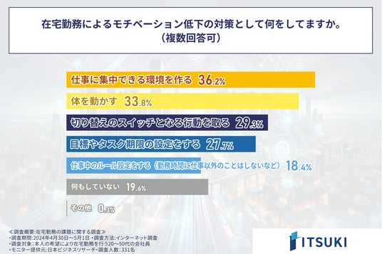 また、「在宅勤務に伴うモチベーション低下のための対策」を尋ねる設問では、「仕事に集中できる環境を作る」が最も多く36.2%、その後に「体を動かす(33.8%)」、「切り替えのスイッチとなる行動を取る(29.3%)」という回答が続きました。在宅勤務は自宅で仕事をすることから、余暇を過ごす時間との切り替えに工夫が必要であり、仕事場の環境面や何らかの行動でその切り替えをしている人が多いとわかりました。