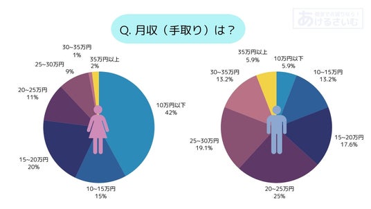 それぞれ最も多い割合は、女性は10万円以下(42%)、男性が20万円~25万円(25%)。この次に多い割合も見ていきましょう。女性15万円~20万円(20%)、男性25万円~30万円(19%)。さっそく収入面で男女差が生まれているのが分かります。