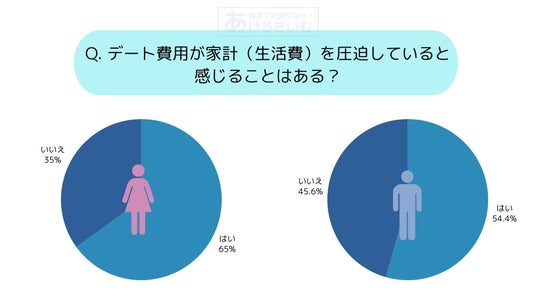 デート費用が家計(生活費)を圧迫していると感じるかという質問に対し、「はい」と回答した男性は45%、女性は35%、その差10%という結果となりました。