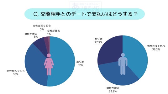 「交際相手とのデートで支払いはどうする?」といった質問で、「割り勘」と答えた女性は52%と最も多いのに対し、男性は27%。男性の回答で、最も多かったのは「男性が多く払うもしくは男性が奢る(合計71%)」でした。