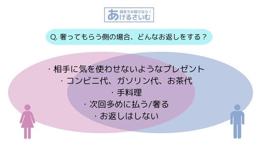 回答を確認すると、奢ってもらったら男女ともに「お返し」をする派が多いという結果に。
