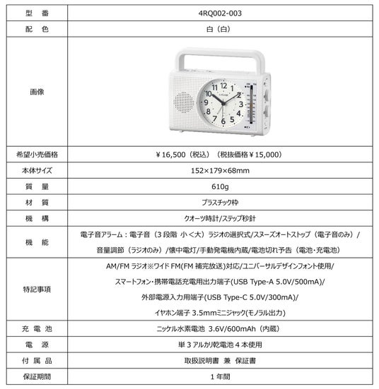 リズム株式会社(取締役社長 湯本武夫)は、普段も非常時も使いやすい便利な機能を搭載した多機能型防災クロック「4RQ002-003」を8月上旬より発売いたします。
