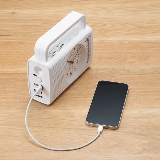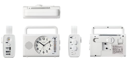 スマートフォン・携帯電話の充電や懐中電灯、手回し発電などの多彩な機能を搭載した多機能型防災クロックです。