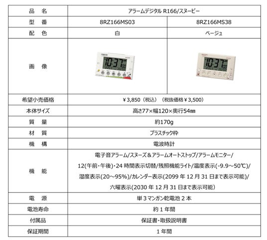 リズム株式会社(取締役社長 湯本武夫)は、くらしになじみやすいシンプルなスヌーピーデザインの電波デジタルめざまし時計「アラームデジタルR166/スヌーピー」を10月初旬より発売いたします。
