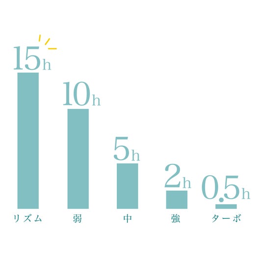 Silky Wind Mobile 2で人気の高かった「リズム風」モードを採用いたしました。リズム風は、一定の周期で風を止めることで、そよ風のような心地のよい風をお届けすることができます。リズム風で最大15時間※使い続けることができるため、前モデルのSilky Wind Mobile 3.1に比べ長時間ご使用いただけます。