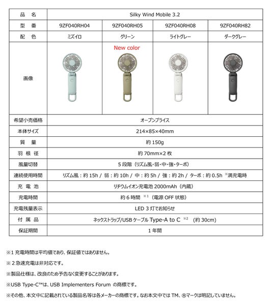 大手ECサイト、販売店にて1位を獲得しています。Silky Wind Mobile 3.2は、お客様の声を基に旧モデルからさらに使いやすくなるよう丁寧に見直し、「リズム風」モードと「充電残量表示」を追加。使いやすいUSB Type-C to Cコードの充電※に対応いたしました。旧モデルのミズイロ、ライトグレー、ダークグレーに新色「グリーン」を加え、4色展開いたします。夏場に限らず、幅広い場面で使用できるリズムのモバイルファンで、くつろぎの時間をお過ごしください。