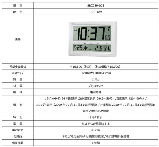 リズム株式会社(取締役社長 湯本武夫)は、遠くからでも見やすさ抜群のサイズ感と、視認性の高い9セグを採用した大画面電波デジタル時計「8RZ239-003」を5月上旬より発売いたします。