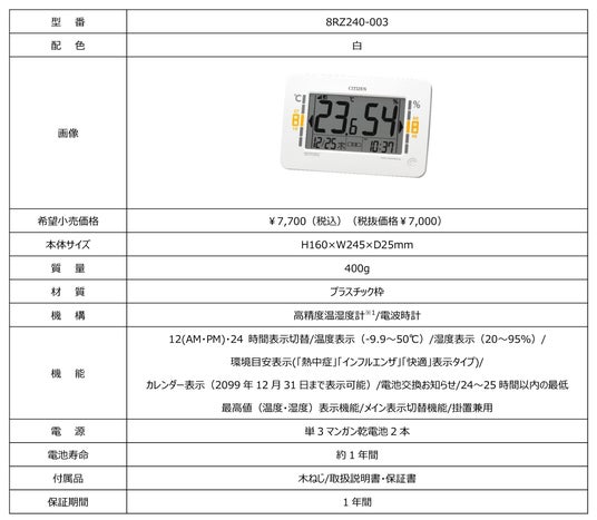 リズム株式会社(取締役社長 湯本武夫)は、毎日の体調管理に役立つ環境目安表示付きの高精度デジタル温湿度計「8RZ240-003」を5月上旬より発売いたします。