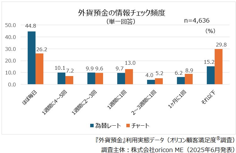 株価と同様、為替レートも日々変動する。外貨の購入や売却を行っている人はどのくらいの頻度で情報をチェックしているのか。今回参考にするのは、実際に外貨の購入や売却を年1回以上行っている全国20~74歳の男女4636人を対象とした、株式会社oricon MEによる調査。具体的な情報として為替レート(テレビ・新聞・インターネットなど)とチャート(分足・日足・週足など)を挙げて、チェックする頻度を質問している。
