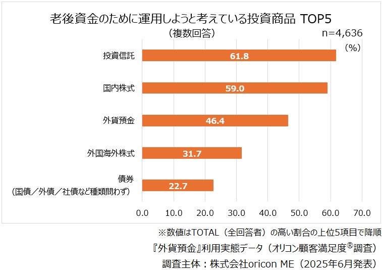 調査では「老後の資金を蓄えるにあたり、積極的に運用しようと考えている投資商品」についても回答を集計している。最も回答率が高いのは「投資信託」(61.8%)。次いで「国内株式」(59.0%)だった。一方で3位には「外貨預金」(46.4%)がランクイン。老後資金の運用先として外貨預金も高い関心を集めていることがうかがえる。