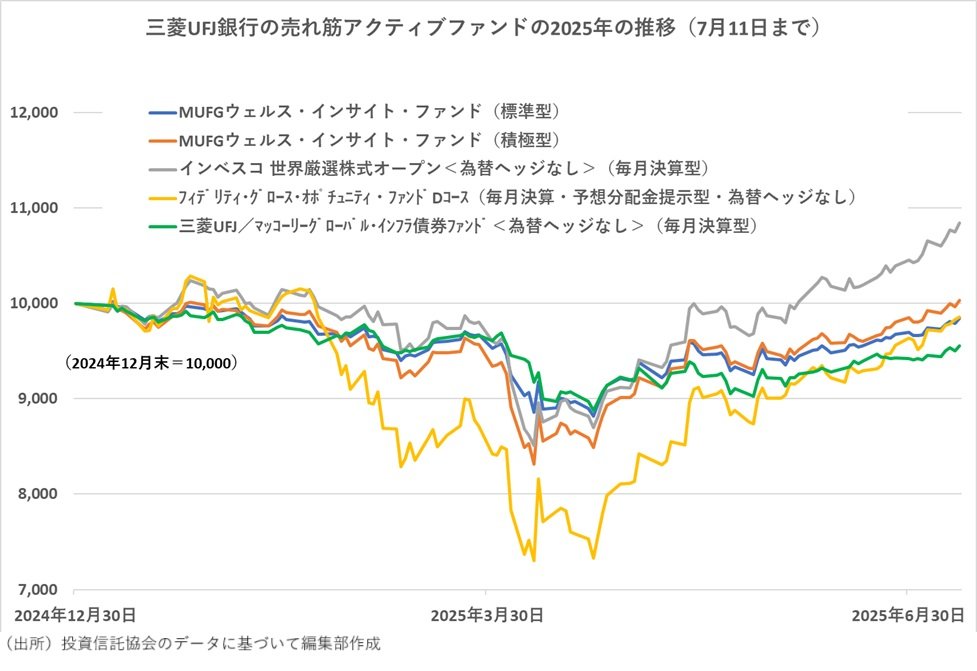 また、「フィデリティ・グロース・オポチュニティ・ファンドDコース(毎月決算・予想分配金提示型・為替ヘッジなし)」も特徴的な動きだった。4月の下落時にはマイナス27.0%と「S&P500」を上回る下落率となったものの、その後の戻り局面で急速に挽回し、7月11日時点では年初来の基準価額の水準が「MUFGウェルス・インサイト・ファンド(標準型)」を上回っている。10位の「三菱UFJ/マッコーリーグローバル・インフラ債券ファンド<為替ヘッジなし>(毎月決算型)」は2025年のパフォーマンスでは「MUFGウェルス・インサイト・ファンド」に劣後するものだった。
