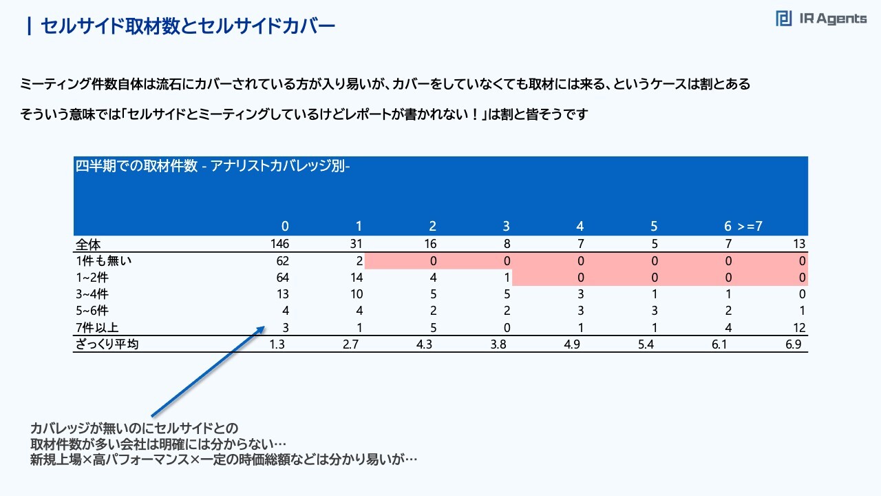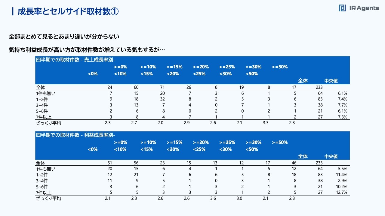 関本:成長率とセルサイド取材数についてです。正直に言うと関係性はわかりません。スライド上段の表で右端にある中央値とは、平均値のことです。取材数が1件もない会社の売上成長の平均値が約6パーセントであることに対して、7件以上取材が入っている会社の平均値が約7パーセントだと示しています。つまり、セルサイド取材が1件もない企業と、セルサイド取材を7件以上行っている企業で、売上成長率に差はないと言っているようなものです。成長率とセルサイド取材数②