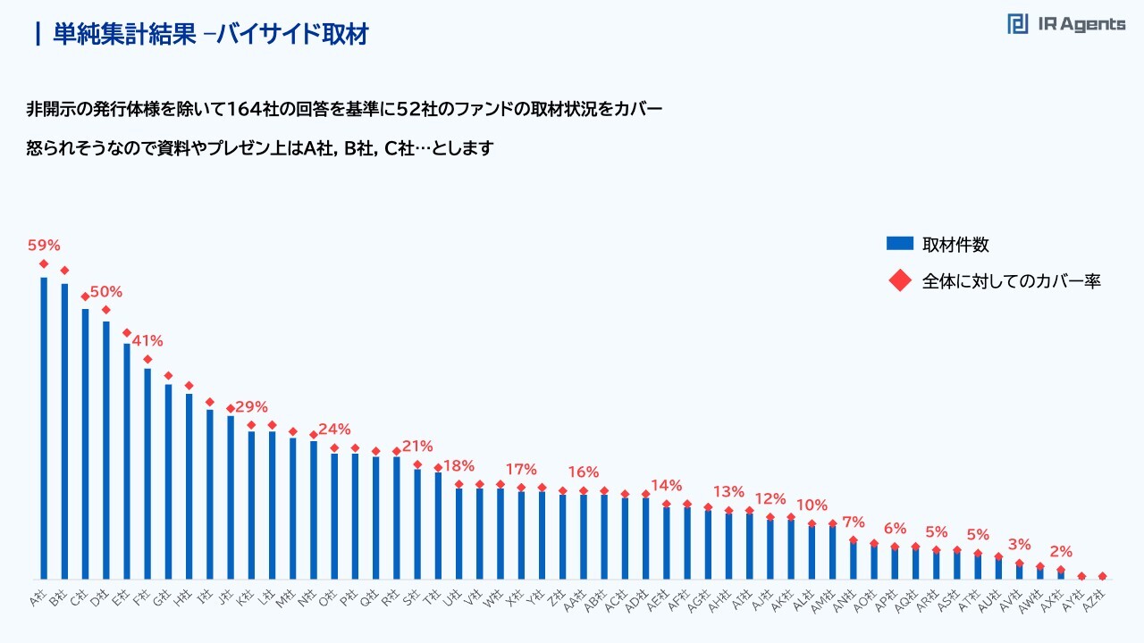関本:続いて、バイサイド取材の結果です。これが今回の調査の本編だと思っています。スライドでは「A社」「B社」「C社」としていますが、参加者向けには補足資料でこれらの企業名を掲載しています。スライド一番左のA社が最も取材件数が多いです。今回「このような人が取材をしにきた」と説明してくれた発行体164社のうち、59パーセントの80社から90社くらいと会っている会社です。前回の調査でA社は、50社くらいの有効回答数に対して45社くらいと会っていたため、今回は母数を増やしたことで「さすがにほぼすべての企業に会っているわけではない」とわかりました。それでも企業の60パーセントくらいには取材を行っているのではないかと思います。裏を返せば、「うちはA社に会えていないな」と思ったら、アプローチしてみると会ってもらえるかもしれません。時価総額