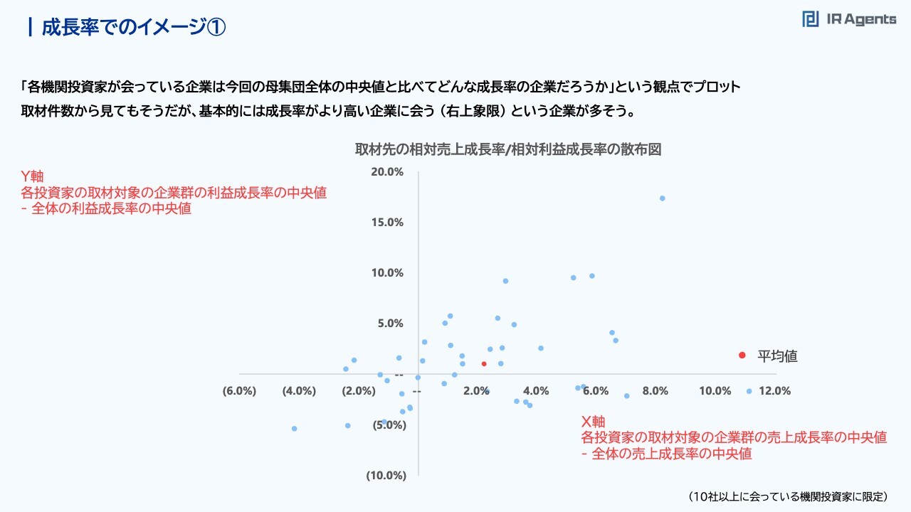 関本:成長率でのイメージです。機関投資家は、今回の母集団全体と比べて成長率が高い企業に会っているのか、それとも低い企業に会っているのか、はたまた平均くらいの企業に会っているのか、という指標になっています。例えば、スライド図の一番右側にぽつんとある点を見てください。これは今回のユニバース約160社のうち、平均値と比べて6パーセントぐらい売上成長率が高い企業というイメージです。さらに、営業利益の成長率も20パーセント近く高い企業です。つまり、高い成長志向を持つ企業を見ていることになります。また、赤い点(平均値)の近くにばらついている企業は、比較的まんべんなく機関投資家が取材している会社です。逆にスライド左下側に飛び抜けている会社は、「業績が悪いところへ会いに行く」という機関投資家が取材している会社です。このグラフの見方としては、「うちは今からまさに利益を出して回収するフェーズだ」という時には、「できれば売上成長を抑えても利益を伸ばすところを好む機関投資家と会えたらいいな」ということです。「うちは業績が悪い状況だが、来期や再来期ぐらいからはボトムアウトしていくはずだ」という場合には、スライド左下の会社を取材する機関投資家が向いているかもしれません。そのような使い方ができると思っています。