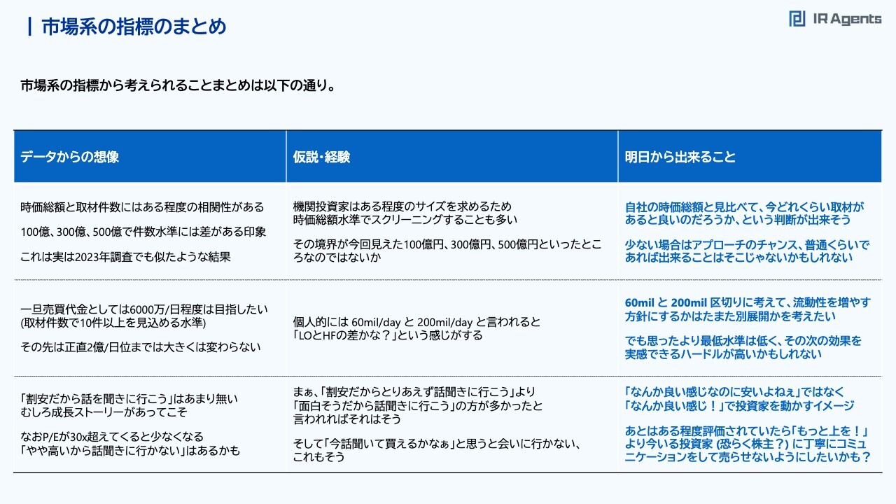 関本:業績系の指標のまとめです。市場系の指標ほどクリアな関係性がないのですが、気持ち成長率が高いほうが目立つこと、時価総額で分けた時に、500億円以下では成長性が意識されている気がするものの、中堅から大企業ではもう知られているという前提があるため、あまり関係性が強くは見られないことがあります。明日からできることとしては、2桁パーセントの売上成長や、それをきちんとイメージできるように伝えることです。中期経営計画を作る会社は、計画を作る時にそのようなことも意識して考えてみるといいかもしれないと思いました。時価総額