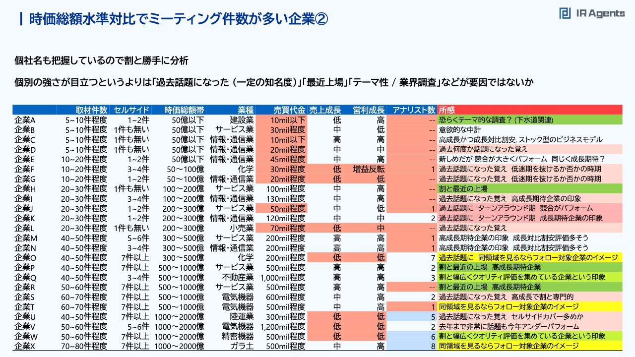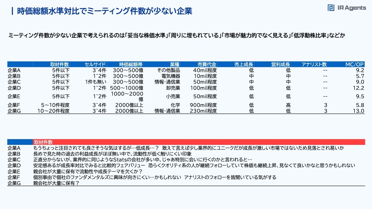 関本:今のお話と似たような点をスライドにまとめました。表の下部に、売上成長と営業利益の成長は低く、売買代金は1日当たり5億円くらいなのにかなりミーティングが多い会社があります。私が運用を担当していた時にも有名だった半導体関連の会社で、先行指標的なビジネスをしているため、そのような意味で周辺調査として話を聞きに行きたい会社といえます。そのような例は「よいIR」なのかというと、そうでもないかもしれませんが、取材件数は多いです。したがって、必ずしも「よいIR」をすることで取材が多くなるとは限らないと思っています。個別の分析についてご説明します。例えば企業Aは、時価総額や売買代金は少ないのに、取材件数は多めです。その事業内容を見てみると、おそらくテーマ的な視点も絡んでいるのかなと思います。つまり、投資家は「とりあえず関連業界は全部行こう」と取材することがあるのです。また、「この会社は過去にひと相場やったことがあるな」と思った会社もあります。過去に話題になった時にミーティングしており、それで覚えてもらっているため、現在はピーク時から落ちて株価が低迷していても、実は取材件数の多い会社があるのです。そのような時でも、過去に株価が上がって「おもしろいビジネスだな」と思ってもらえたことで、売買代金や時価総額に比べて「株価が落ちてきているけれども、最近どうなの?」という取材がけっこう入ってきてくれます。したがって、「1回大きく株価を上げるのは、意外と知名度を上げるにはいいかもしれない」という見方はあると思います。また、最近上場した企業についても、上場したタイミングが非常によいため、どんどん顔と名前を覚えてもらえる機会になるのではないかと思います。時価総額水準対比でミーティング件数が少ない企業