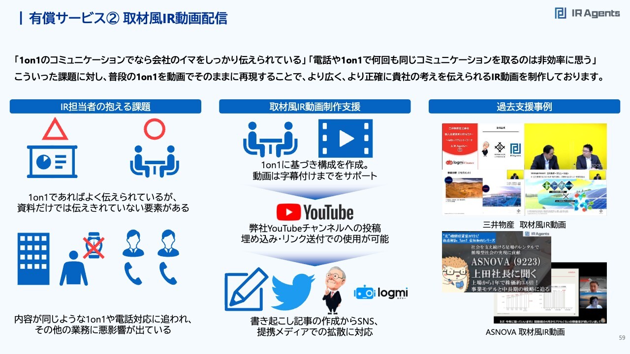 関本:また、IR資料作成のサポートとして中期経営計画などを作成しています。有償サービス② 取材風IR動画配信