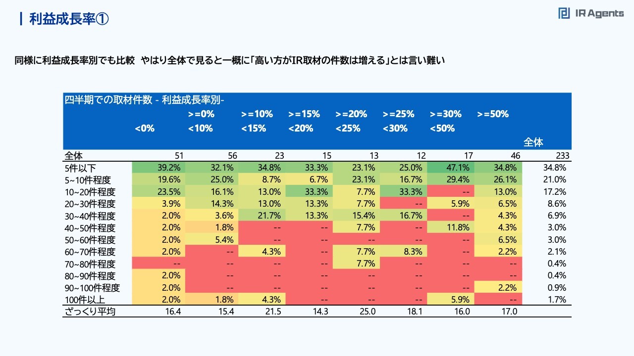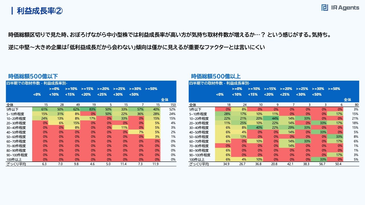 関本:ほぼ影響がないかもしれませんが、時価総額で区切って抽出してみました。そうすると、時価総額500億円以下だと気持ちスライドの右下の件数が増えています。例えば、売上成長率が15パーセントより低い企業の中では50パーセント以上が5件以下の取材件数で、売上成長率15パーセント以上では5件から10件程度に増えてきます。ごく緩い関係ですが、売上成長率が高いほうが取材件数は増えやすいのかと思います。逆に、時価総額500億円以下では、売上成長率が15パーセント以上あると、投資家に成長企業として見られやすいのかと思います。一方で、時価総額500億円以上で平均を取ると、売上成長率10パーセントくらいはあるほうが取材件数は増えると思いますが、売上の成長がない企業であっても100件以上取材がある会社もあり、幅広いです。意外と時価総額が大きくなってきた後は「成長しているから見に行こう」ではなく「もうこの会社のことは知っているけれども、足元はどうなっているんだ?」のような、企業そのものの人気ではなくて、知っている上で今どのような状況なのかというテーマ性のほうが大事になってくるのかもしれないです。また、売上成長率が50パーセント以上などかなり成長している企業については、逆に取材件数の平均が少し減っています。サンプル数が少ないためたまたまともいえると思いますが、一方で、「業績が伸びてピークアウトしている」と考えられている可能性もあると思っています。そのような意味では、「この成長はまだ続くのです」としっかりと主張できるかどうかで、取材件数が増減するのかもしれないと思いました。利益成長率①