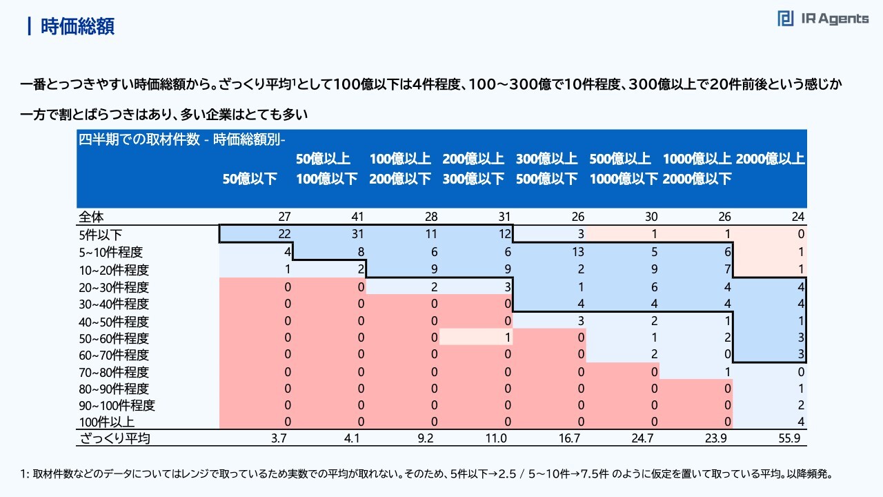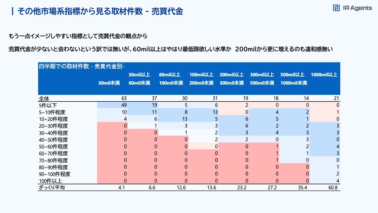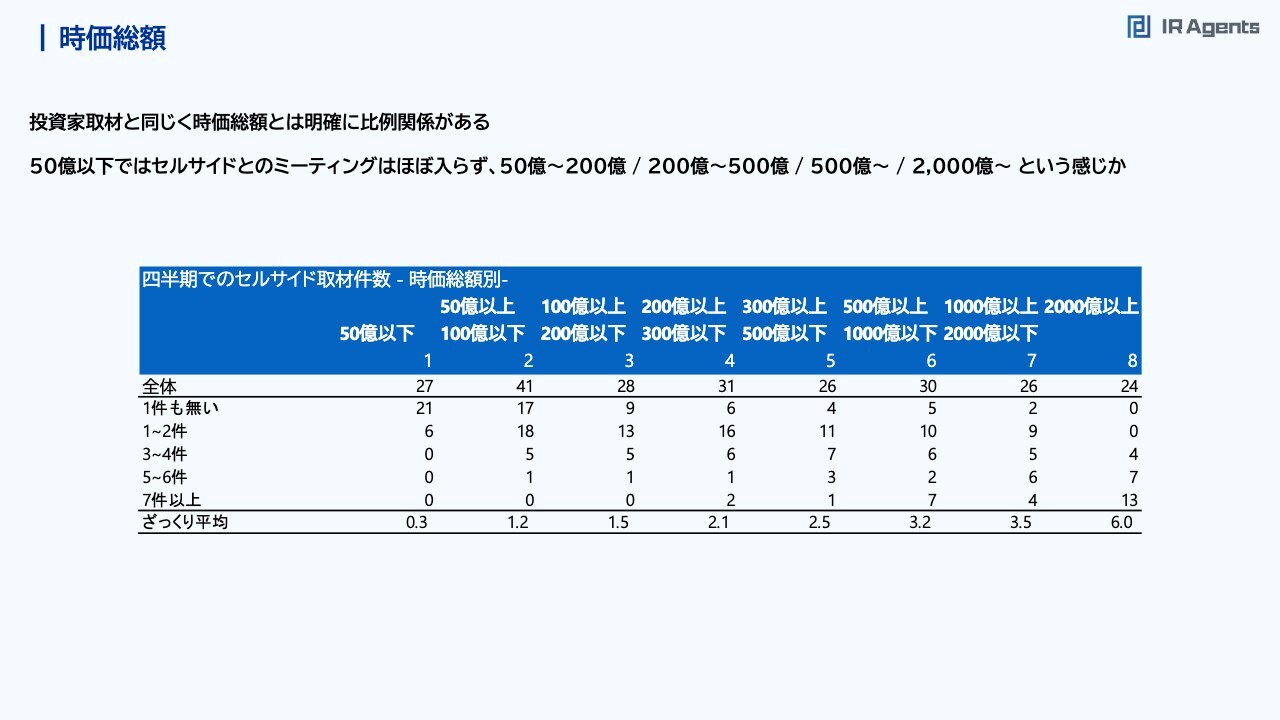 関本:細かいところをお話しします。最初に市場系の指標として流動性についてです。時価総額、売買代金、バリュエーションから、取材件数を考えてみたいと思います。まず時価総額について、スライド表の下部に企業数と中心値でざっくりと計算した平均を記載しています。時価総額が100億円以下の企業は四半期で4件くらいで、100億円から300億円の企業で10件くらいです。300億円を超えてくると16.7件となり、500億円を超えてくると20件を超えてきます。したがって、「うちの会社は時価総額300億円なのに、5件から10件しか取材がない」という会社がいれば、取材件数が足りていないことも考えられますので、もう少し増やしてもいいかもしれません。逆に「うちは時価総額100億円だけれども、20件くらい取材している」という会社は、取材件数自体は「かなり注目を浴びている度合い」と捉え、このデータを振り返りに使ってもらえるといいかと思います。時価総額2,000億円以上の会社では、100件以上取材をしている会社が4社もあります。かなりばらつきがあり、多い企業はとても多く、少ない企業は少ないのは仕方がないことだと思っています。時価総額水準対比でミーティング件数が多い企業①