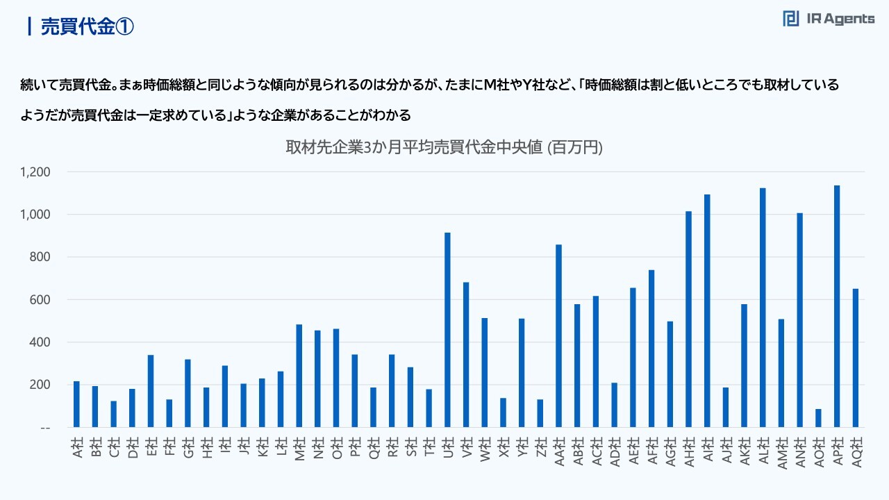 関本:次は売買代金です。こちらも時価総額と同じ傾向が見られますが、今回の調査で、時価総額はわりと低いところでも取材しているのに、売買代金は高いところを求めている企業が見えてきました。売買代金②
