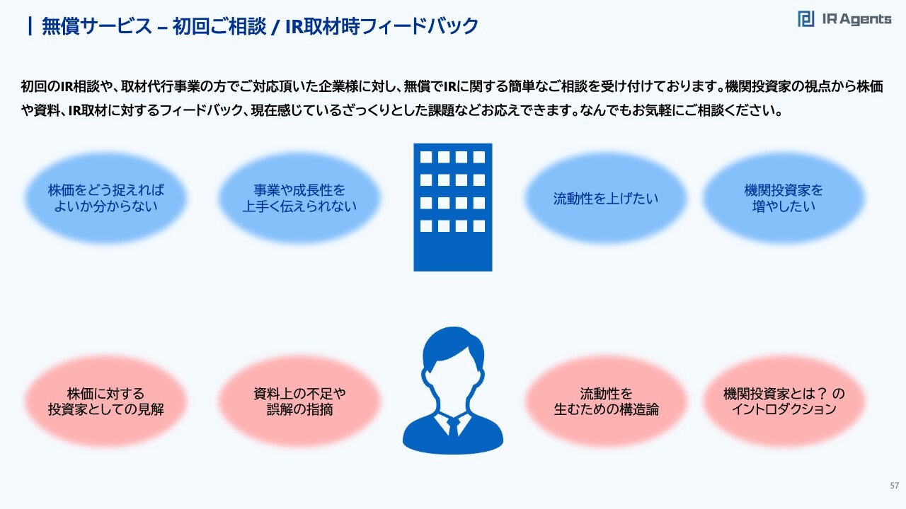 関本:弊社のIR支援事業についてです。スタンスとしてはいろいろな会社があります。私のところでは実際に1on1取材をした後に、企業の「自分たちの会社の価値や株価をこう思っています」というところと「取材を通して私からはこう見えています」というところを踏まえて、実際の株価と比較します。市場との株価にギャップがあると感じたら、何が課題なのかを特定した上で、「戦略を考えましょう」「資料作成をブラッシュアップしましょう」「動画を作りましょう」などと提案するプロセスで行っています。無償サービス – 初回ご相談/IR取材時フィードバック