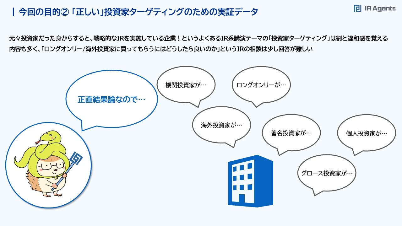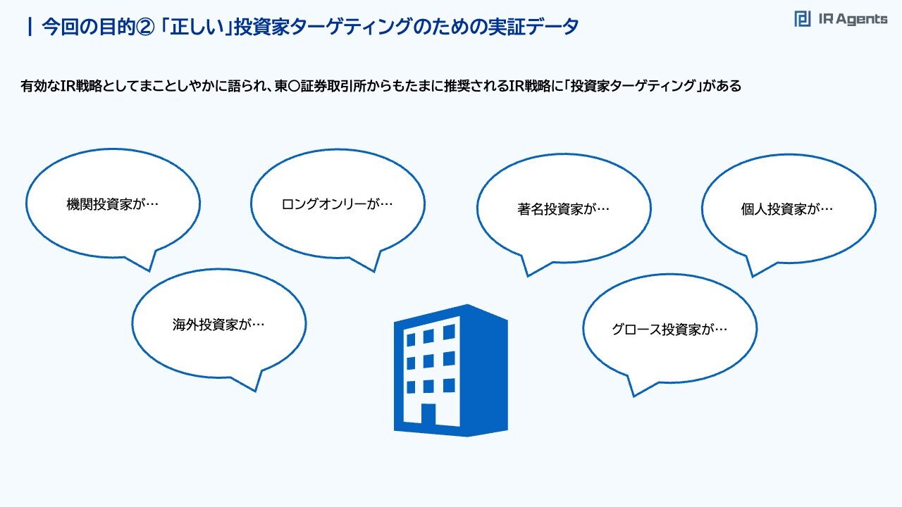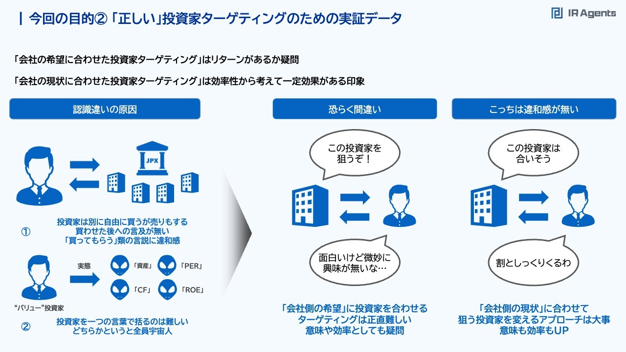 関本:2つ目は「『正しい』投資家ターゲティング」です。IR戦略として、まことしやかに語られる「投資家ターゲティング」は、「この投資家を狙いたい」「海外投資家、バリュー投資家、グロース投資家を狙いたい」というものです。今回の目的②「正しい」投資家ターゲティングのための実証データ