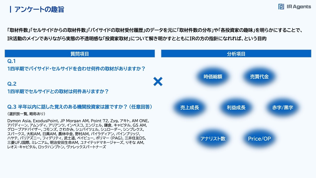 関本:初めに今回の調査目的、アンケートの趣旨です。セミナーにご参加いただいているみなさまの中にも、アンケートにご協力いただいた方がいるかと思います。アンケートの目的は、取材件数、セルサイドの証券会社からの取材件数、バイサイドの取材受付履歴のデータを元に、どのようなところが取材されているのか、また各投資家の趣味は何なのかを明らかにした上で、実態の不透明なIR取材対応について調査することです。今回の目的①「自分たちのIR取材対応状況はどうなのか」に対する基準を作る