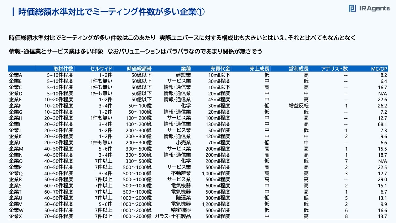 関本:次に、どのようなところとのミーティング件数が多いのかまとめてみました。時価総額帯が50億円以下で、セルサイドはないが5件から10件くらい取材している会社や、時価総額帯が100億円から200億円で、20件から30件くらい取材している会社で気になったのは、情報・通信業とサービス業が多い点です。全体の業種構成では、情報・通信業とサービス業を合わせて33パーセントのため、そもそも情報・通信業とサービス業の数が多いという背景はあります。スライドの表でも半分以上は情報・通信業とサービス業のため、それらは取材が入りやすく、それ以外の業種は少ないのかもしれません。スライド右端のMC/OPは、時価総額を営業利益で割ったもので、バリュエーションの代わりのような数字です。6.4倍もあれば約70倍もあって、かなりバラバラです。したがって、割安だから件数が多い、割高だから件数が多いという相関はないのではないかと思っています。富山:実態として、「よいIRを行っているから件数が多い」というようにはならないのですか? 関本:なかなかならないと思います。「よいIR」とはすごく難しいのですが、私は市場とギャップがないIRのことだと思います。「説明したとおりに業績が出てきて、次の四半期以降もそのとおりに業績が出てくる」というのはおそらく「よいIR」ですが、逆に「資料を見たらわかるから、取材は止めておこうかな」という人も出てきます。「開示がないから直接聞かないとわからない」「この会社は説明会でしか開示しない話がある」というのが果たして「よいIR」なのかと聞かれると、これは悪いIRです。一方で取材件数は多いのではないかと思います。時価総額水準対比でミーティング件数が多い企業②