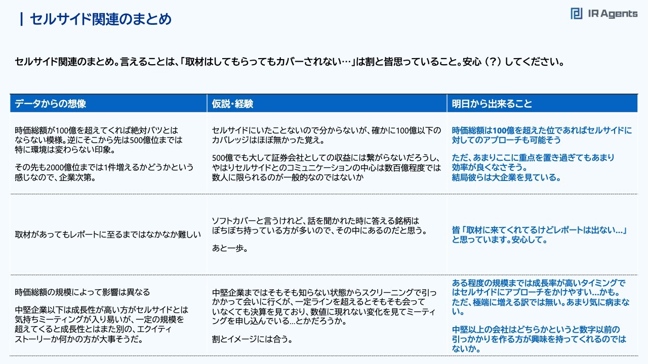関本:セルサイド関連のまとめです。まず、時価総額が50億円以上になると、セルサイドのミーティングが来ます。一度も会ったことがないのであれば、アプローチをかけてみてもいいかもしれません。あるいは、バイサイドなどに依頼して紹介してもらうのもいいです。ただし、時価総額を200億円、500億円まで増やせばセルサイドの取材件数が増えるかというと、そうでもありません。1社、2社しか証券会社が来ない状況から無理やり増やそうとするよりは、「時価総額をきちんと上げていこう」「もっと他のアプローチを考えたほうが効率がよいかもしれない」ということです。また、カバレッジから考えた時に、ミーティングがあってもレポートを書いてもらえません。おそらく6割、7割の会社がそう思っているため、「ご安心を」とは言えませんが「そういうものなんだな」と思っているほうがいいかもしれません。時価総額の規模によって影響が異なることが、今回の新しい発見だと思っています。企業の規模が大きくなればなるほど、成長性よりもその前段階、成長前の変化点などを、投資家や証券会社が気にするようになると思います。以上が、セルサイドとの付き合い方だと思います。単純集計結果