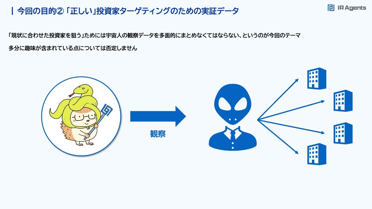 関本:そのような意味で「十分なIR活動ができているのか」という点について、アンケートを取ってデータをまとめました。最終的に本日参加された方が「今の状態だったら、セルサイドの取材件数をもう少し増やせるのではないか」「当社の取材件数はかなり多いので、もっと他の資料や動画、新規投資家獲得に力を割いた方がいいのではないか」など、効率のよいIRのリソース配分ができたらいいと思っています。今回の目的②「正しい」投資家ターゲティングのための実証データ