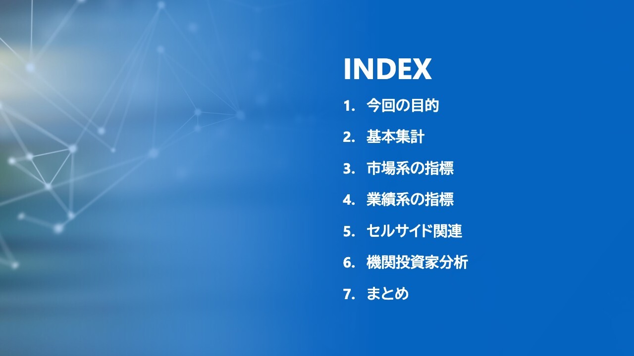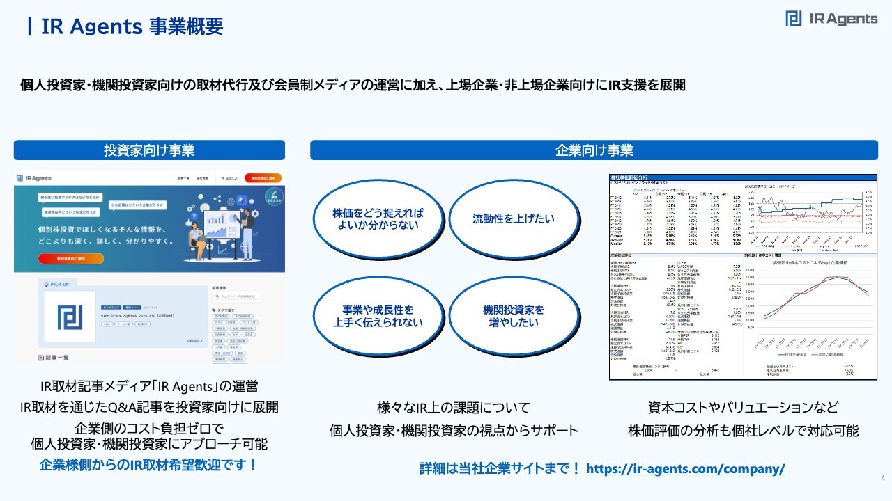 関本:事業の1つは、投資家向けのIR取材代行メディア「IR Agents」の運営です。もう1つはいわゆる企業向けのIR支援です。どのように株価を考えたらいいのか、IR戦略、IR施策をどのように打っていったらいいのかというサポートや、資料作成のサポートなどをしています。INDEX