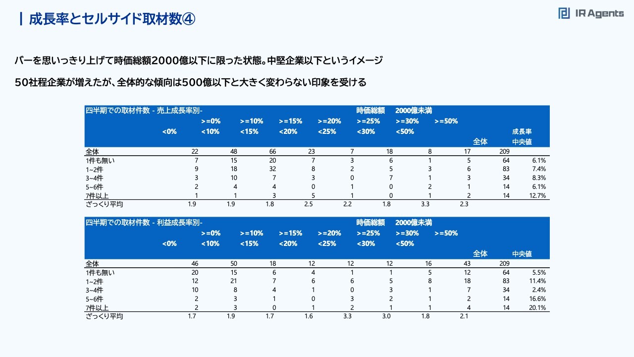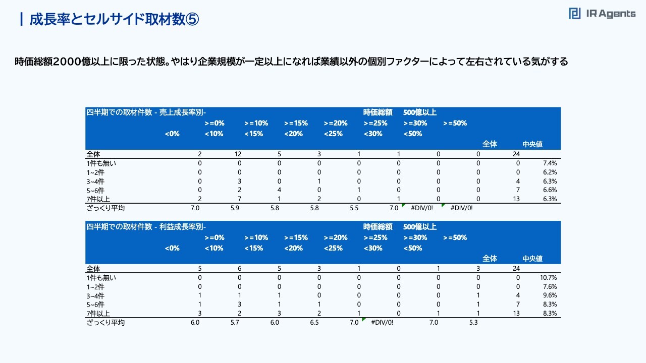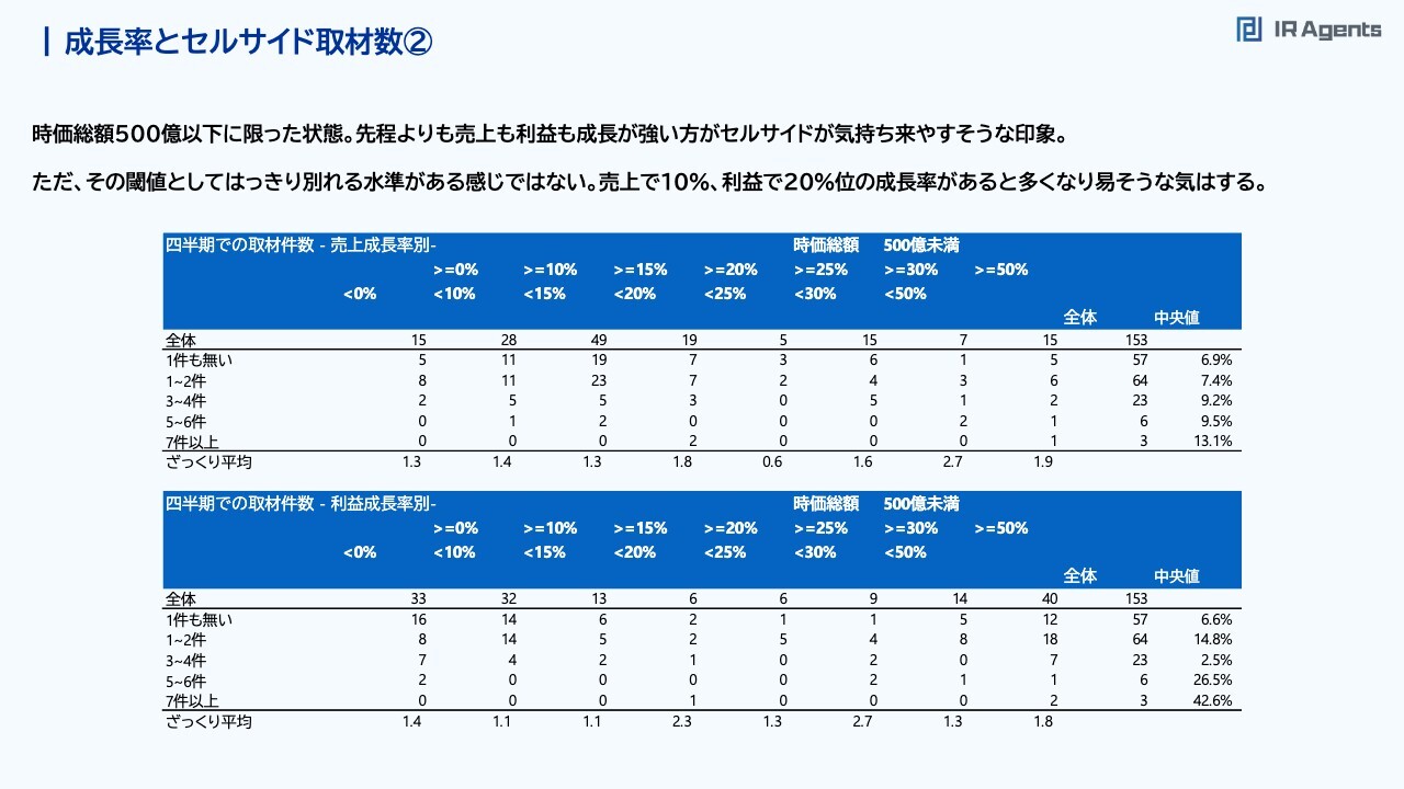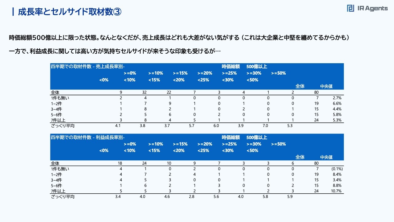 関本:このスライドは時価総額500億円以上に絞った状態です。先ほどよりも数値が緩いです。時価総額500億円以下では、セルサイド取材が1件もない会社だと、売上成長率の中央値が6.9パーセントでした。その一方で、7件以上取材が来ている会社だと約13パーセントまで数字が伸びており、倍以上の差がありました。時価総額500億円以上の場合だと、取材が1件もないのが2.7パーセント、7件以上あると5.3パーセントです。それでもおよそ2倍の差がある状況ですが、先ほども3パーセント程度の差だったため、時価総額500億円以下の場合との差はあまりないです。利益成長率に関しては、取材が7件以上来ているほうがやはり高いため、「利益成長率が高いほうが、セルサイドが取材に来そうな印象はある」ぐらいで見ていくのがいいと思います。成長率とセルサイド取材数④