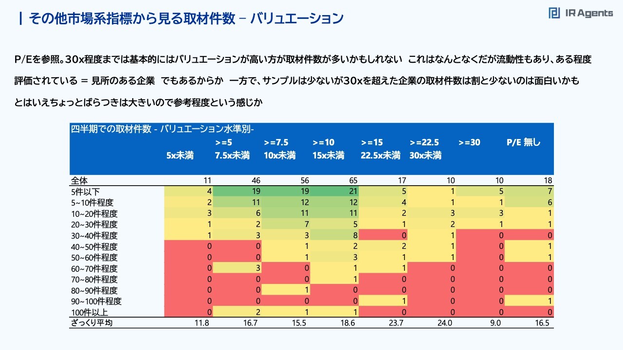 関本:バリュエーションです。このスライドだけグラデーションで示しているとおり、よくわかりません。「高いと多い気がする、低いと少ない気がする」というような部分もありますが、平均を取ると、バリュエーションがPrice/OPで5倍未満、PERで1.5倍くらいです。7倍の会社の平均件数は12件なのに対して、30倍くらいありそうな会社は20数件あることを考えると、バリュエーションが高いほうが取材に行きやすいケースが多いのではないかと思います。これは裏を返すと、ビジネスモデルがサービスや情報・通信業などの高いものである、またバリュエーションが高いことは注目度も高く人気もあり、流動性もあるためこのようになっているという表現もできます。したがって、一概にバリュエーションが影響するとは言いにくいです。おもしろいのは、Price/OPで30倍を超えてくる、PER50倍近くになる会社は逆に取材件数が減っています。けっこう示唆的だと思いますが、投資家が「バリュエーションが割高かもしれないな」「ここからどれくらいリターンを取れるんだっけ?」という思考をした時に劣後してしまうと、取材に来る人が少なくなるかもしれないと思います。足元で見た目のPERが高くて取材件数が増えていないと思った時には、「PERが下がるだろうという将来の見通しをきちんと伝えなければいけない」という考え方ができるのかもしれません。市場系の指標のまとめ