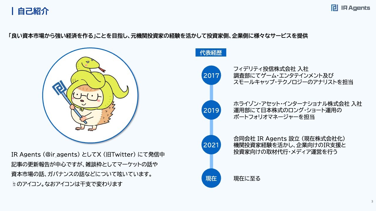関本:ご存知の方もいらっしゃるかもしれませんが、2023年にIR取材の動向調査を行い、結果をまとめてプレゼンしました。今回はそのアップデート版として、累計掲載数が1,700社を超えたログミーFinanceの力を借り、またアンケートを行いました。まず、簡単に自己紹介をします。私はもともと運用会社におり、1社目でアナリストを、2社目でポートフォリオマネージャーを担当した後、今の自分の会社であるIR Agentsを立ち上げて、企業と投資家の資本市場におけるコミュニケーション、いわゆるIRの領域で色々なサービスを提供しています。IR Agents 事業概要