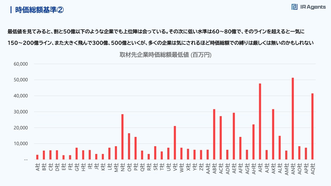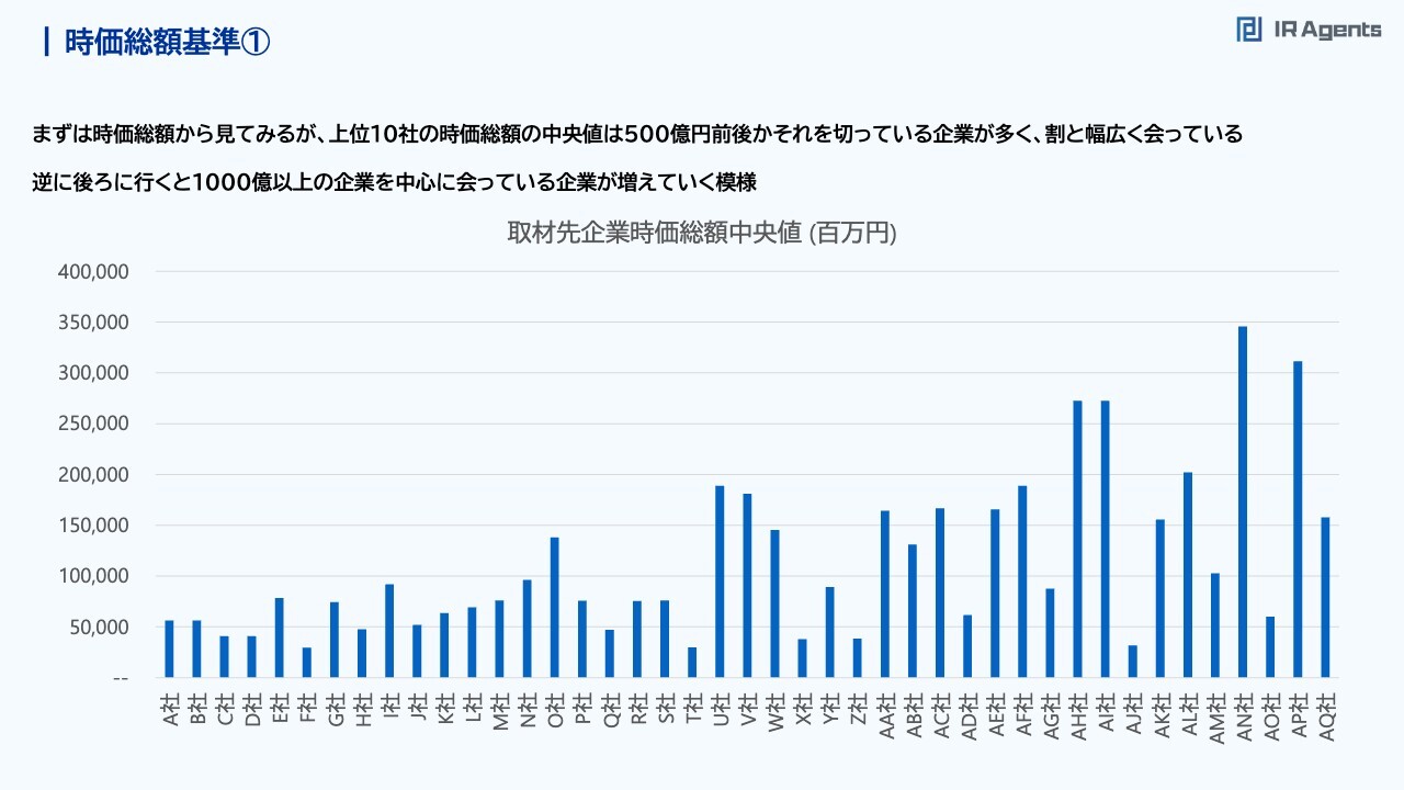 関本:時価総額から見てみましょう。スライドのグラフは左から順に、投資家にたくさん会っている会社と考えてもらえればと思います。上位10社は、時価総額の中央値が500億円前後を切っている会社が多く、かなり幅広く投資家と会っている会社だと思っています。個別の会社名については、補足資料を見ていただくのがいいと思いますが、みなさまもご存知の企業が多いのではないのかと思います。某日系大手ロングオンリーのような会社や、某国内大手ヘッジファンドのような会社がずらっと並んでいます。もし「この会社にも会っていなくて、そんなに取材件数が多くないな」とみなさまが思うようでしたら、彼らの取材があってもいいかもしれません。あるいは証券会社に取材をスケジュールできないか依頼したら、意外と受け入れてくれるかもしれないと思います。一方でO社・U社・V社のような、時価総額の中央値の段階で1,000億円や1,500億円を超えている企業もあります。実はこれらも国内大手のロングオンリーだったり、外資系大手のロングオンリーだったりします。「この人たちに会って買ってもらいたい」ということはどの企業も思っていますが、時価総額などで見た時のサイズのハードルが高いかもしれないということは、把握しておいたほうがいいと思います。したがって、「今のフェーズだったら、うちはこの会社に買ってもらえる」という考えもあるかもしれません。おそらく、日本企業の時価総額のグループから見た時に「1,500億円はけっこう遠い数字で、それと比べるとうちは小さいぞ」と考える企業のほうが多いと思います。やはり、ターゲットにする会社によって、件数は違ってくると思います。取材件数が少ない会社、例えばグラフ右側のAK社・AL社・AM社などは、大型株を中心にしている状況なのかと見えたりします。時価総額基準②