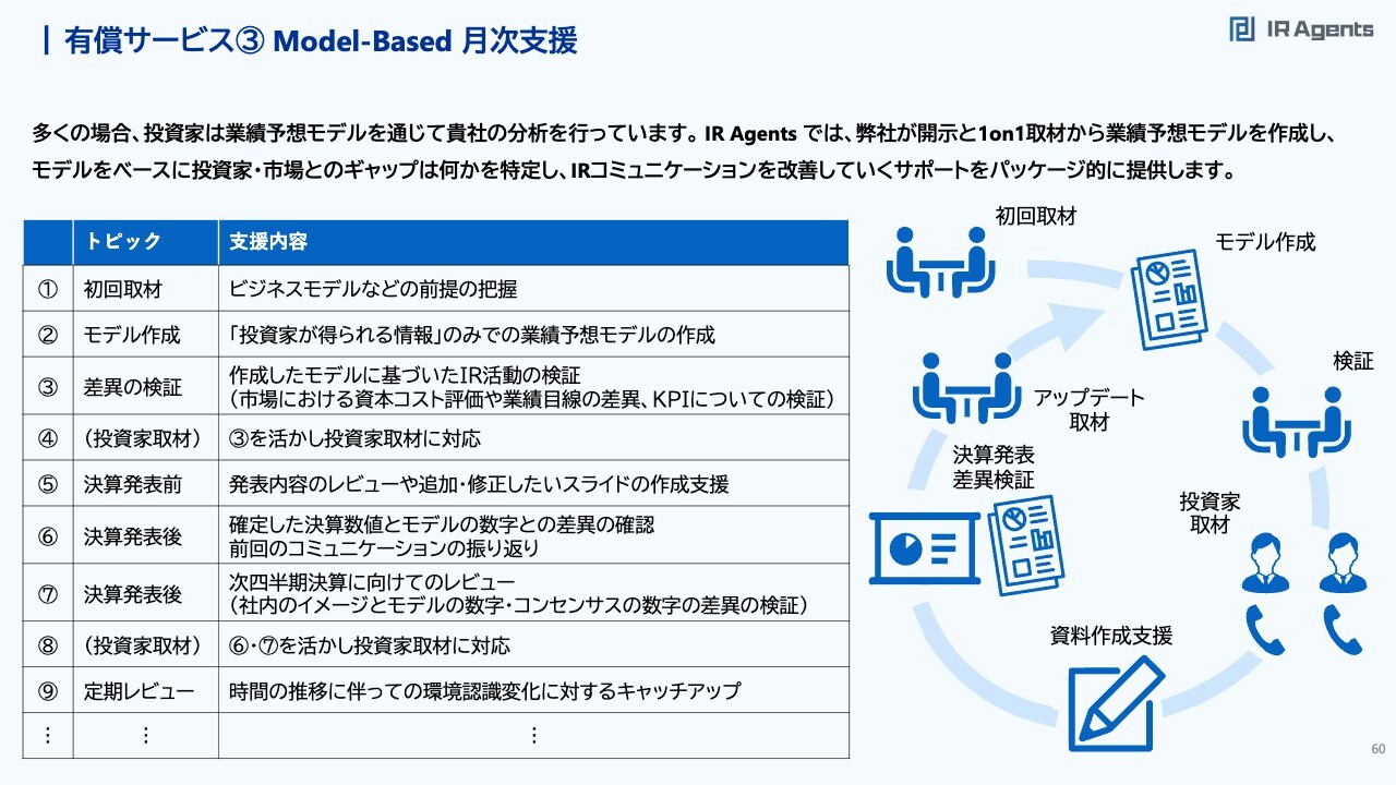 関本:他にはModel-Basedの月次支援です。ユニークなのは、私のほうで投資家が作る業績予想モデルを作った上で、企業に共有しながら「新セグメントの成長性は情報が足りなくて入れられませんでした」「この費用はこういう表現をしたから、こういう増加を入れています」といった内容を示します。それに対して、企業から「もっと費用は増えるんです」「これは成長が織り込んでもらえていない」「どのような開示をしたらいいですか?」などの質問をいただき改善していきます。投資家の業績予想モデルをどう組み替えていくかというような発想から、IRコミュニケーションをPDCA的に改善していきましょうというサポートもしています。