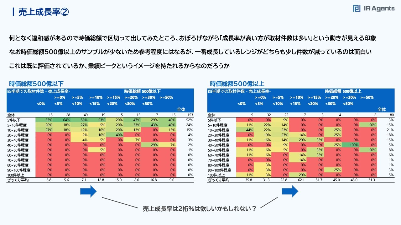 関本:市場系の指標のまとめです。仮説や経験として、時価総額100億円、300億円、500億円で取材件数に差がある気がすること、売買代金ではいったん6,000万円/日くらいを目指したく、その後は2億円くらいまであまり変わらないことなどがあります。6,000万円/日や2億円/日というと「ヘッジファンドとロングオンリーの差かな」とも思っています。私はどちらもしていましたが、ヘッジファンドは6,000万円/日くらい売買があったら取り組めるという考え方もありますし、ロングオンリーだと「少なくとも2億円/日ないと駄目だよ」とファンドマネージャーに言われることもあります。そのような意味での水準の差かと思います。バリュエーションについては、「割安だから話を聞きに行こう」ということはあまりないため、やはり成長ストーリーがあってこそだとまとめられるのかと思っています。売上成長率①