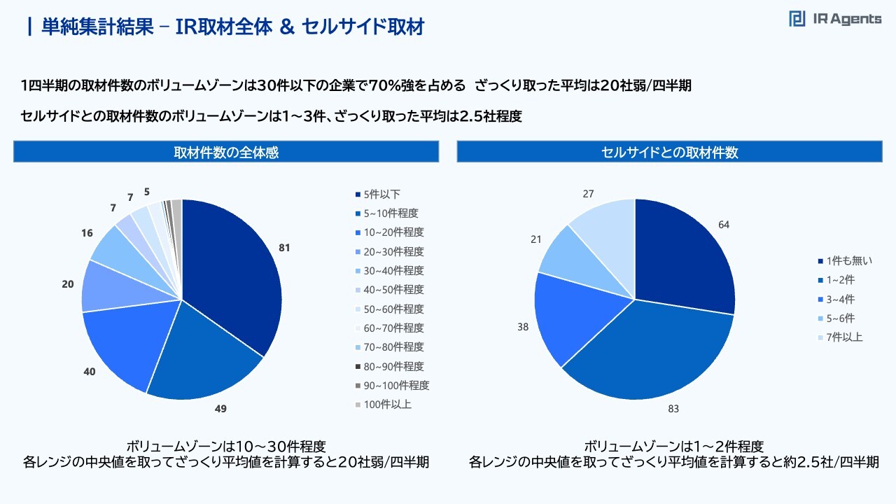関本:単純な集計はスライドのような結果でした。1四半期の取材件数のボリュームゾーンは30件以下の企業が70パーセント強を占める状況で、5件以下の企業も3分の1くらいあります。5件から10件程度の企業が20パーセントくらいで、10件から20件程度も20パーセントくらいです。したがって、30件くらい実施していたら十分で、平均20件実施していたらいいのではないのかと思っています。セルサイドとの取材件数のボリュームゾーンは1件から4件ですが、1件もない企業も4分の1くらいあります。やはり「取材を受けたことがない」という企業があっても仕方がないという状況です。単純集計結果 –バイサイド取材