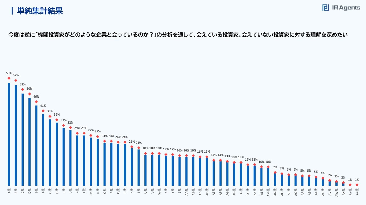 関本:最後は機関投資家分析です。このデータはほとんど、どこにも提示されていないのではないかと思っています。日本IR協議会などで作っているかもしれませんが、私は見たことがありません。このような個別情報を共有いただきありがとうございます。回答者の方には、ファンドの名前を並べて、この四半期で会った覚えのある投資家にチェックを入れてもらいました。全部で5、60社あったにもかかわらず1個ずつチェックいただき、本当にありがとうございます。集計の結果、投資家にたくさん会っている企業と、そうでもない企業、まったく会っていない企業がありました。時価総額基準①