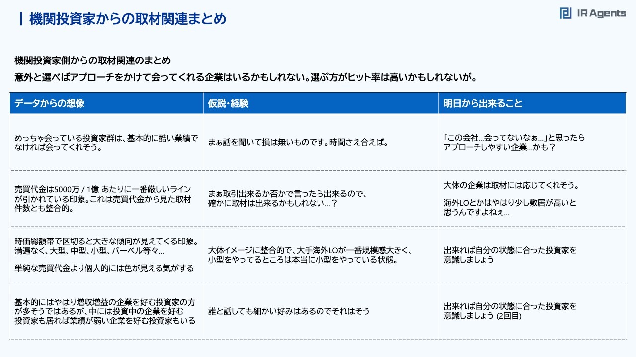 関本:続いて、「国内ロングオンリーがよい」「海外ロングオンリーがよい」「ヘッジファンドは嫌だ」というような話です。今回、独断と偏見で各社の属性を分けてみましたが、時価総額の中央値や売買代金の状況は、国内ロングオンリーとヘッジファンドではあまり違いはありません。ヘッジファンドのほうが、気持ち売買代金が高いほうを期待すると思っています。一方で、海外ロングオンリーがかなり目立っており、想定する時価総額が高そうだということを今回感じました。会社のフェーズによっては「『海外ロングオンリーに買ってほしい』というのは、ハードルが高いのではないか」と話しています。機関投資家からの取材関連まとめ