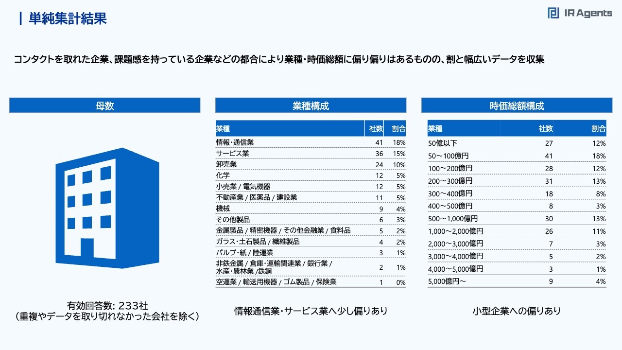 関本:基本的なアンケートの中身です。今回の有効回答数は233社でした。前回の2023年は70社から80社くらいだったため、3倍以上になり本当にうれしいです。業種構成としては、情報・通信業、サービス業が多く、まだカバーしきれていない業種もあり、難しいと思っています。時価総額構成としては、50億円以下、100億円以下、200億円以下を合わせて40パーセントくらいになっているため、小型企業への偏りはあるとご理解ください。単純集計結果 – IR取材全体&セルサイド取材