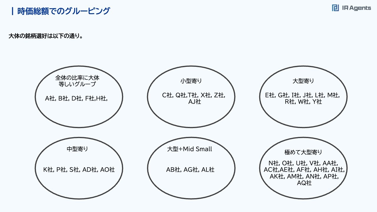 関本:時価総額のグルーピングについてです。補足資料にも書いていますが、全体の比率にだいたい等しく、まんべんなく会っている企業や取材の中で小型寄りに会っている、あとは極めて大型寄りといったグループがあります。「うちの今のフェーズから考えると、C社・Q社・T社・X社・Z社・AJ社は、会っていなかったらアプローチをかけてもいいかもしれない」「うちはこれまでこの会社と会ってきたが、時価総額が上がり成長してきた中で、中型の企業でも見てくれるK社・P社・S社・AD社・AO社にもアプローチをしたら会ってくれるんじゃないか?」というように、このクラスターを使えればと思っています。ちなみに、私が「そんなことがあるんだ」と感じた配分がこの中にあります。スライド内の「大型+Mid Small」は、時価総額2,000億円以上の企業に取材している割合と、500億円から1,000億円の企業に取材している割合が高いです。少し変な配分ですよね。流動性が高いところでマーケットにキャッチアップするような運用をしつつ、時価総額が500億円から1,000億円ぐらいの会社が倍になるところでアルファを稼ぐ、といった戦略を行っていると、おそらくこのような配分になるのかもしれません。逆に、「500億円以下は流動性が低すぎて見ません」「1,000億円から2,000億円も、注目度が上がりすぎてアルファが取りにくいから見ません」というような、大型とMid Small両方の傾向を持つ企業もいるということは、今回調べてみておもしろい発見でした。