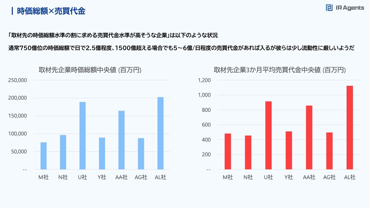 関本:先ほど「時価総額の要求はわりと高いのに売買代金が低い」という話をしました。スライドのグラフを見た限りでは、M社・N社・U社・Y社・AA社・AG社・AL社が、それに近いと思っています。M社は時価総額中央値は750億円で、500億円を割っているぐらい低くはありませんが、低い層です。しかし売買代金は4億円ぐらいを求めています。実は、時価総額が750億円ぐらいの会社に求める売買代金は、他の会社を見ると2.5億円ぐらいあったら大丈夫と言っています。しかし、M社はその1.5倍ぐらいの売買代金を求めているわけです。このような傾向は、大手の会社や内需ギャップを見ているヘッジファンドなどに多いです。お客さまからの解約があった時に、すぐに株を売ってお金を作り、返金しなければいけないなどといった理由があるからこそ、高い売買代金を好む傾向があります。